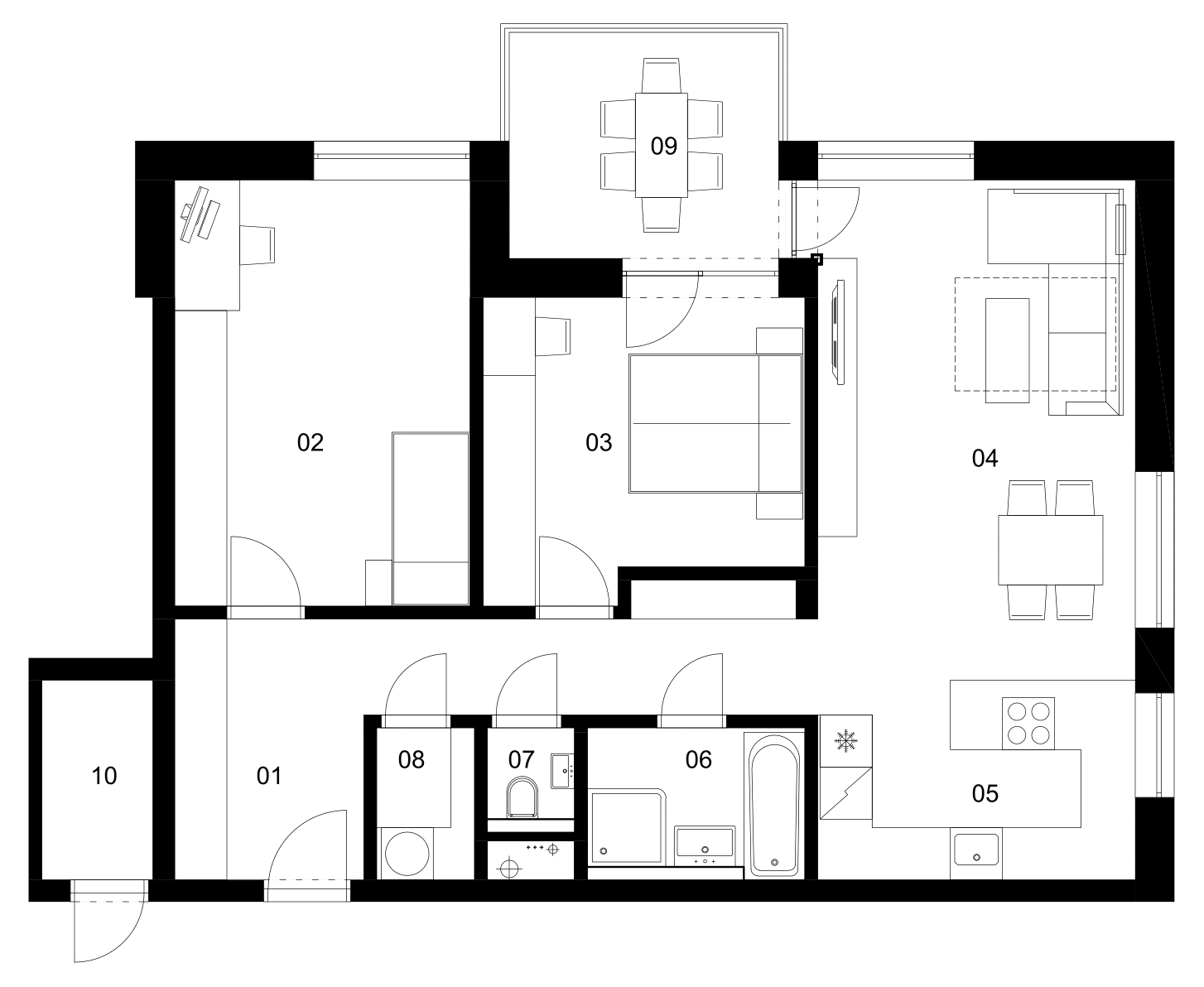Jednokrídlové, otváravé, plné. Dverné krídlo s priznanými závesmi. Dverný rám z MDF. Povrchová úprava z CPL fólie.